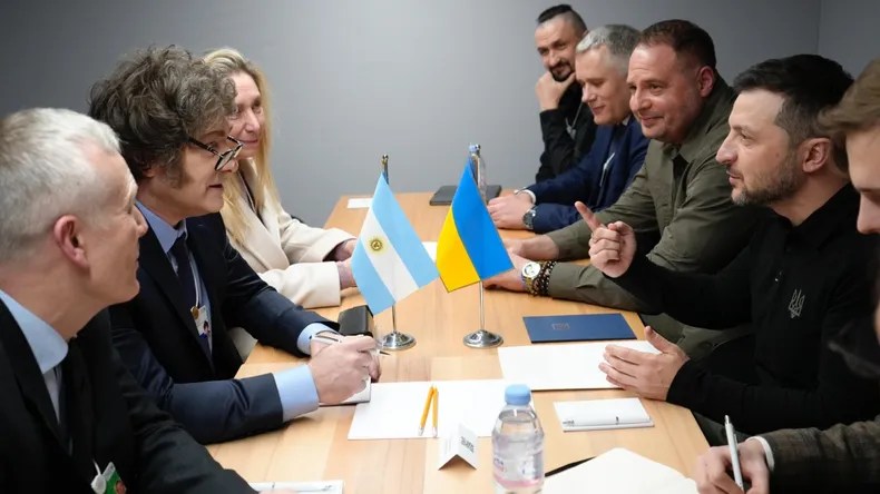 En Davos, Mile se reunió con el presidente de Ucrania, Volodímir Zelenski, y le manifestó el apoyo argentino en la guerra que mantiene con Rusia. Ambos mandatarios ya tuvieron varios encuentros bilaterales y conversaciones telefónicas desde que comparten el mismo cargo.