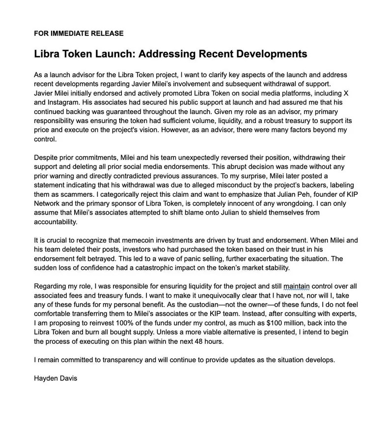 Por último, Davis quiso llevar tranquilidad a los inversores y dejó en claro que no tomó ninguno de esos fondos para beneficio personal: «Como custodio, no propietario, de estos fondos, no me siento comodo transfiriéndolos a los asociados de Milei o al equipo de KIP». Y propuso una solución: «Después de consultar con expertos, propongo reinvertir el 100% de los fondos bajo mi control, hasta u$s100 millones, nuevamente en Libra Token y quemar todo el suministro comprado», expresó.