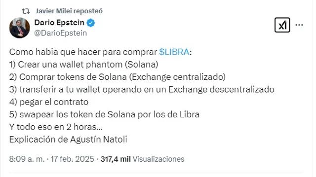 En medio de este contexto, Milei parece reírse de los más de 40.000 afectados que generó y reposteó un instructivo en su cuenta de Twitter sobre cómo comprar la moneda digital, generado por Darío Epstein, que detallaba los pasos para adquirir $LIBRA en un proceso que involucraba varias plataformas y billeteras virtuales.