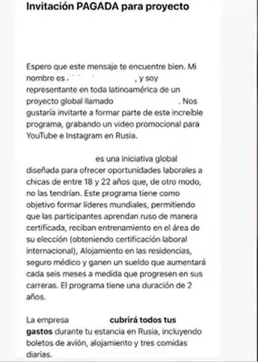 Además, el texto aseguraba que el proyecto brindaría a que las “participantes aprendan ruso de manera certificada, reciban entrenamiento en el área de su elección, alojamiento, seguro médico y un sueldo que aumentará cada seis meses a medida que progresen en sus carreras. El programa tiene una duración de 2 años”.