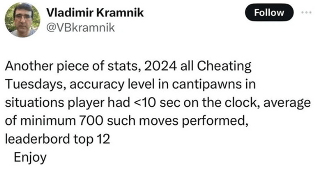 Como el GM Navara no es afecto a las redes sociales ni tiene interés en convertirse en influencer, no se defendió, ni pidió explicaciones, ni polemizó en ese territorio. Así a Vladimiro le quedó el campo orégano en el éter para hacerse el desentendido e ignorar la tropelía de haber puesto sin fundamento alguno a David en el podio de los tramposos.