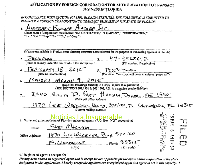 Estas entidades están registradas en la División de Corporaciones del Departamento de Estado de Florida, con dirección principal en 1470 Lee Wagener Blvd, Suite 100, Fort Lauderdale, FL 33315, donde Machado figura como agente registrado.