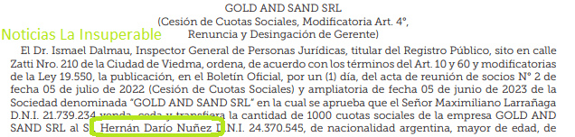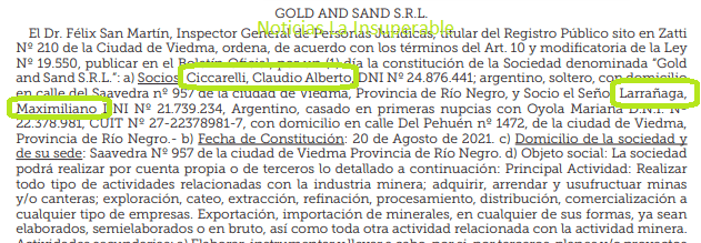 Una de estas, según indica el Boletín Oficial de Río Negro, es GOLD AND SAND S.R.L., constituida el 20 de agosto de 2021, vinculada a la actividad minera. En la misma, será socio mayoritario Ciccarelli con el 90% del capital, mientras que el 10% restante estaba en manos de un tal Maximiliano Larrañaga.