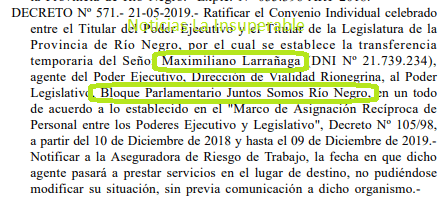 Larrañaga es parte del Poder Ejecutivo rionegrino, y en los años 2018 y 2019 pasó a formar parte del personal del Bloque Parlamentario Juntos Somos Río Negro, la Alianza política liderada por el gobernador actual, Alberto Weretilneck.