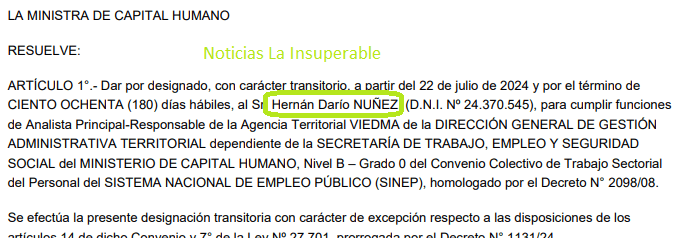 Poco tiempo después, en julio de 2024, y ya con el nuevo gobierno libertario en el poder, Hernán Darío Núñez será designado en el Ministerio de Capital Humano con la firma de la ministra-amiga de Milei, Sandra Pettovello, poniendo así un nuevo nexo entre los integrantes del gobierno oficialista y el narcotráfico.