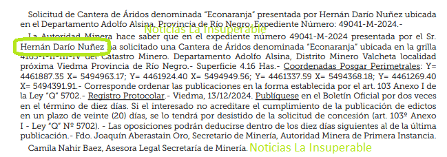 El Boletín Oficial de Río Negro publicó en enero de 2025 una solicitud de cantera de áridos denominada “Econaranja”, presentada por el mismo empresario y funcionario libertario Hernán Núñez. El expediente, tramitado en el Departamento Adolfo Alsina, muestra que el funcionario de Pettovello, además de sus cargos públicos, continuaba participando de negocios extractivos vinculados a la misma red de empresas en la que se movían Ciccarelli y Machado.