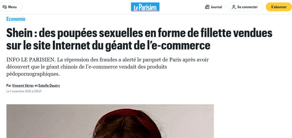 La Dirección General de Competencia, Consumo y Represión de Fraudes (DGCCRF) detectó el 31 de octubre que Shein ofrecía en su sitio muñecas sexuales con apariencia de niñas.