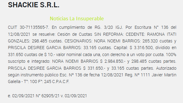 Dos años más tarde, en abril 2021, deja su cargo Ramona Itatí González y la reemplaza como gerenta otra desconocida: Nora Noemí Barrios. No solo eso, en agosto va a haber una cesión del capital de la empresa, pasando a ser las únicas accionistas la tal Nora Noemí Barrios junto a una nueva «prestanombre»: Priscila Desiree García Barrios, flamantes dueñas de la empresa, al menos en los papeles.