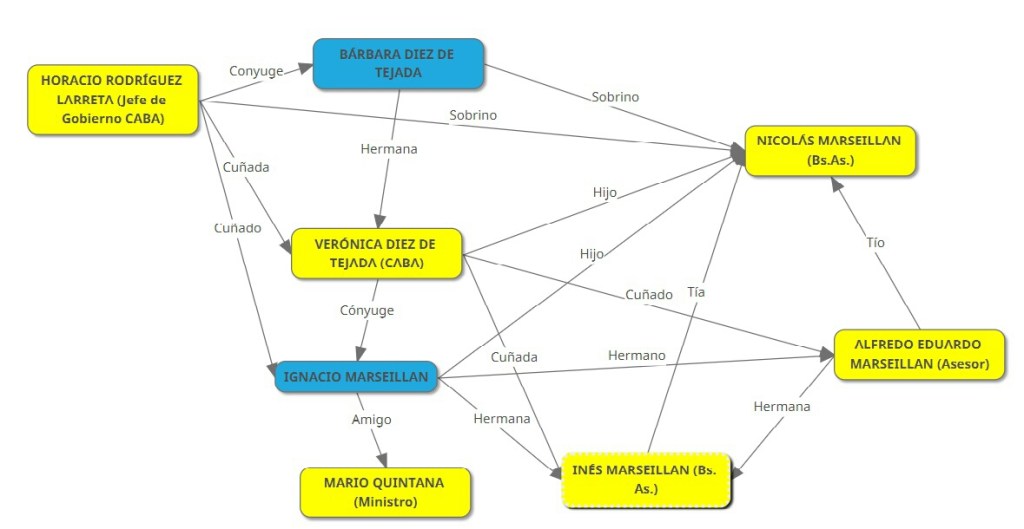 Luego se van sumando personajes adultos, todos con prontuario amarillista: Gastón Terán Castellanos, ex ENACOM y GCBA; Francisco Riesgo; y, sobre todo, Ignacio Marseillan, empresario ligado a JP Morgan, Siderar, Spencer Stuart, Globant y ACDE. Pero su verdadero valor estaba en otro lado: es ex cuñado de Horacio Rodríguez Larreta, parte del engranaje familiar de los Diez de Tejada, y fue socio de Mario Quintana, aquel que la Justicia imputó por el negociado de rutas aéreas con Flybondi.