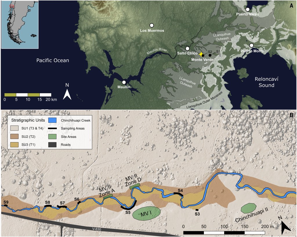 (A) Ubicación del sitio Monte Verde (estrella amarilla) en la región de los Lagos del sur de Chile, en relación con las morrenas terminales de la última glaciación (gris claro) y las llanuras de outwash (gris oscuro) asociadas a ellas. Las ubicaciones de la sección 1 (S1) y la sección 2 (S2) se indican con puntos negros. Los puntos blancos señalan localidades cercanas.