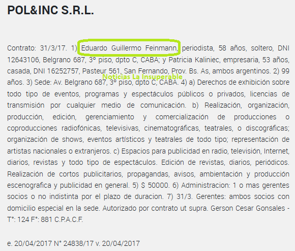 Por eso es tan sencillo congeniar pagos con posturas periodísticas en el recorrido de Feinmann. Y para verlo claramente, pongamos el caso de POL&INC S.R.L., empresa creada por el «periodista» en 2017 junto a su productora Patricia Kaliniec.