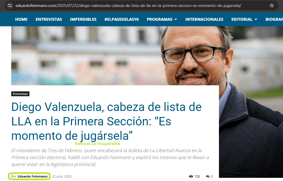 Quienes siguen habitualmente al «periodista», habrán notado como fue, entre otras cosas, tornándose com una suerte de vocero del ex Intendente de 3 de Febrero Diego Valenzuela, quien asumió su banca como senador en la Legislatura de la Provincia de Buenos Aires. Tras dejar la intendencia de Tres de Febrero y luego de frustrarse su llegada a la Agencia de Seguridad Migratoria a nivel nacional, Valenzuela había oficializado su lugar en el bloque de La Libertad Avanza. En este punto, recordemos que fue el propio Feinmann quien dio la primicia en X.