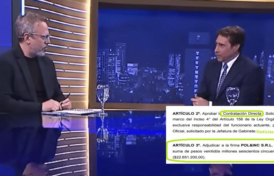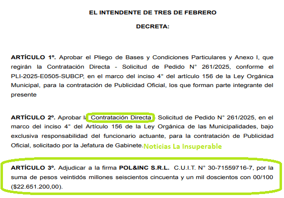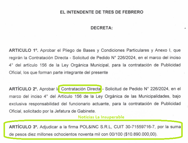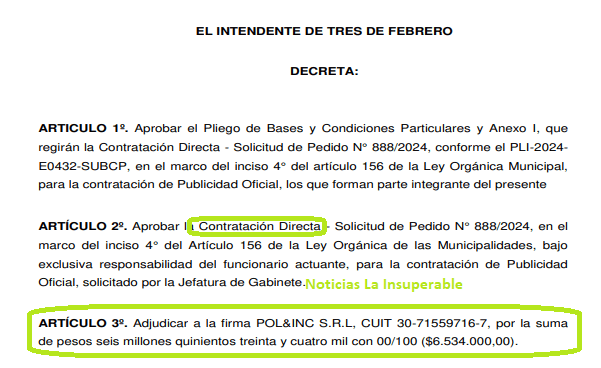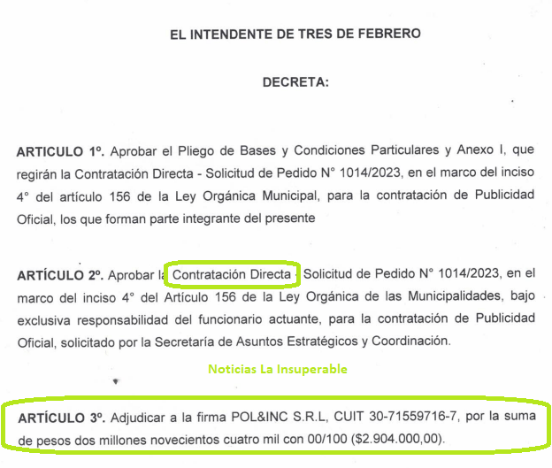El 21 de diciembre de 2023, por Decreto de Valenzuela, se aprobó la Contratación Directa de «POL&INC S.R.L, CUIT 30-71559716-7, por la suma de pesos dos millones novecientos cuatro mil con 00/100 ($2.904.000,00).»