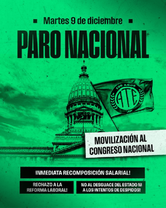 ATE confirmó un paro para este martes 9 en rechazo a la reforma laboral que Milei impulsa en el Congreso. … Más